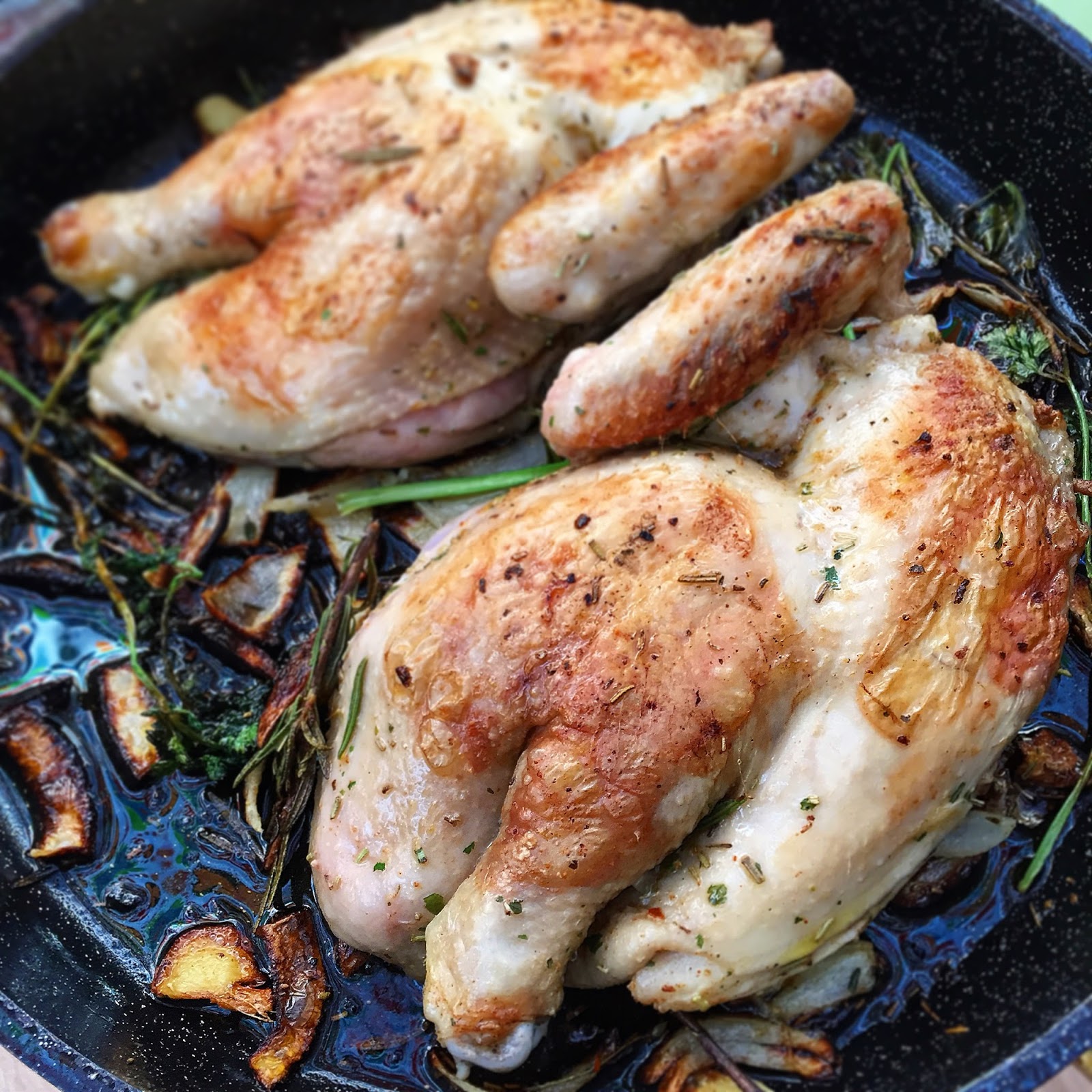 Transfer chicken to the oven, with chicken breast placed facing down (this allows the breast to soak up flavours).
