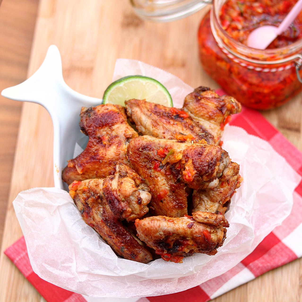 Roast for 20 minutes. After 20 minutes, transfer chicken on to another baking tray. Add 2 tablespoons chilli sauce, toss the honey wings and ensure they are well coated.